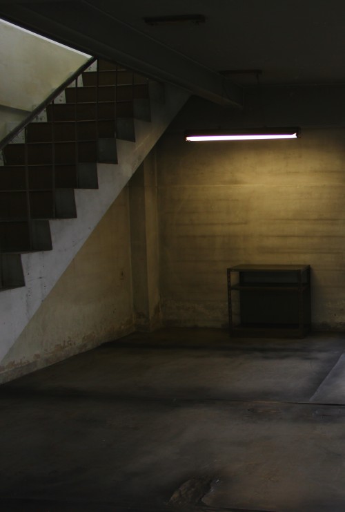 1Fと2Fをつなぐ階段裏は、面白い撮影スポットの一つです。天井が徐々に低くなっているため、アジト風の切迫した空間が演出できそうです。古びた鉄製の棚と、レトロな蛍光灯が配置されています。